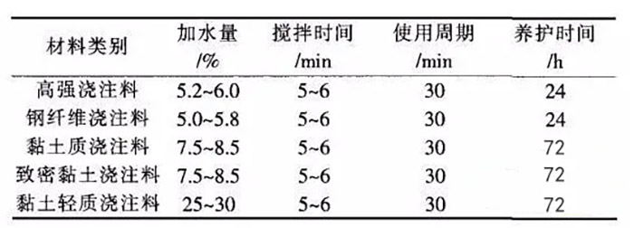 (7)攪拌好的澆注料不得二次加水使用,并應在30min內用完,剩余的混凝土(澆注料)須丟棄。澆注料養護按照表1執行,驗收合格后方可拆模。