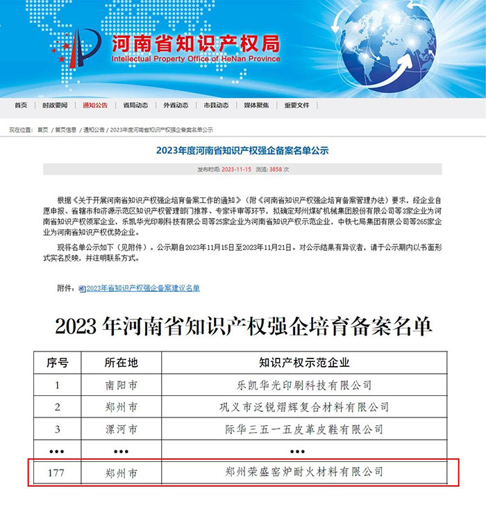 喜訊!榮盛耐材榮獲河南省知識產權優勢企業